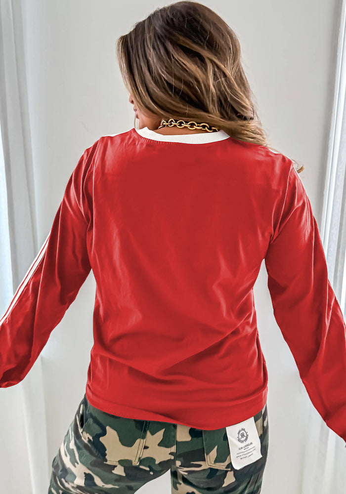 Fiery Red Varsity Striped Accent Contrast Crew Neck Long Sleeve T Shirt