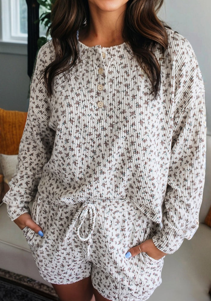 White Spiral Ribbed Floral Print Long Sleeve Henley Top Drawstring Short Set