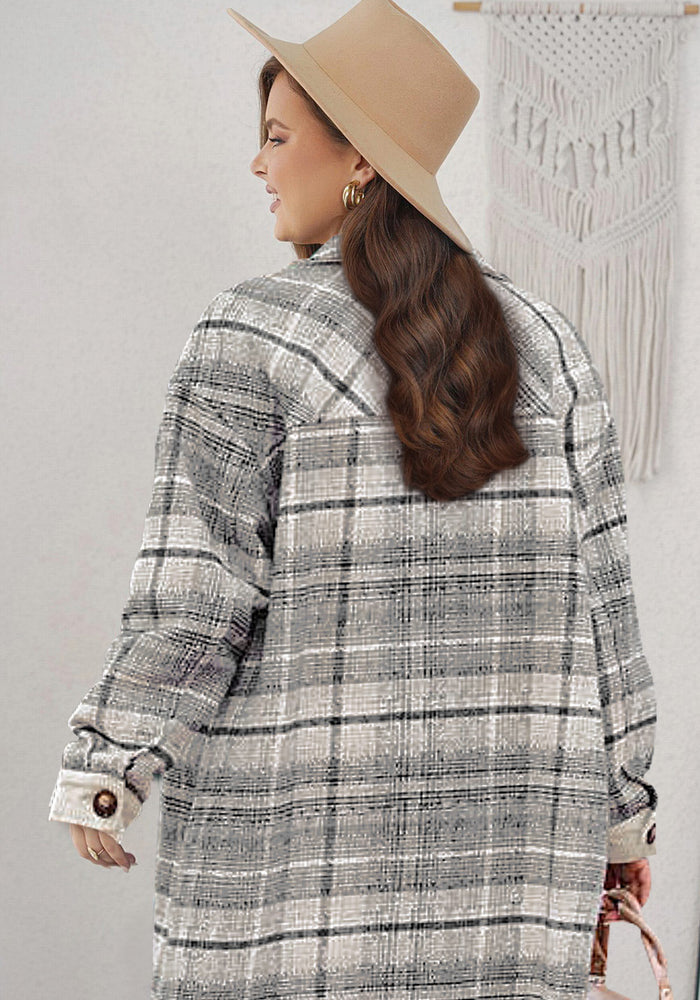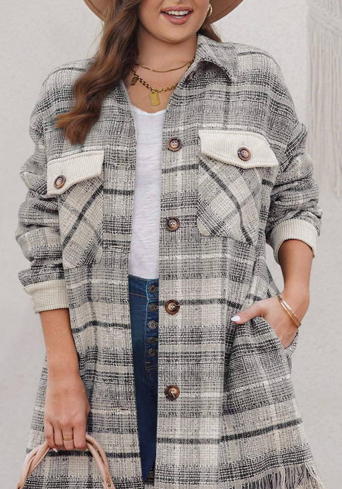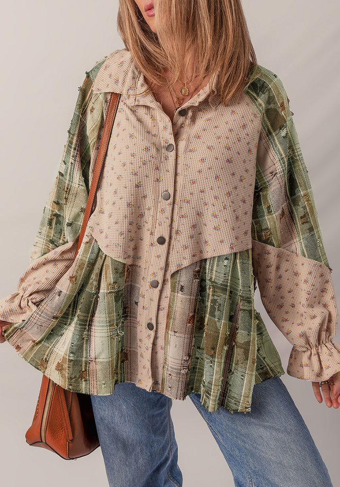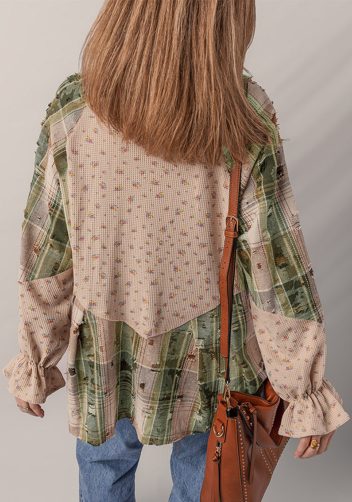Mist Green Boho Floral Plaid Patchwork Distressed Detail Ruffled Sleeve Waffle Knit Shacket