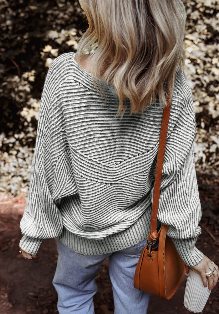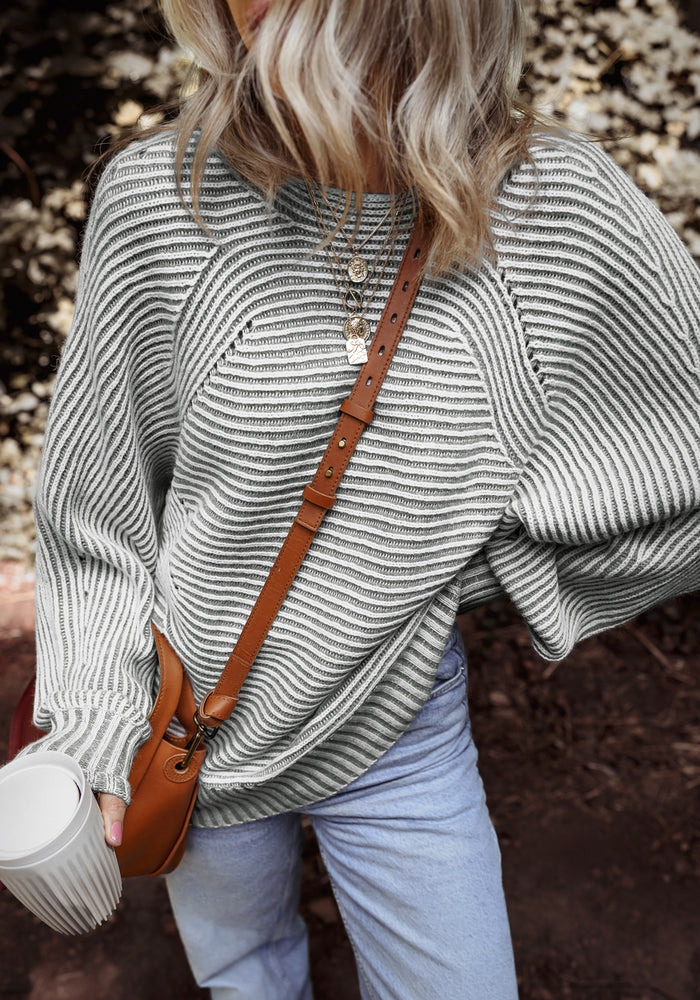 Medium Grey Striped Print Ribbed Knit Boat Neck Baggy Sweater