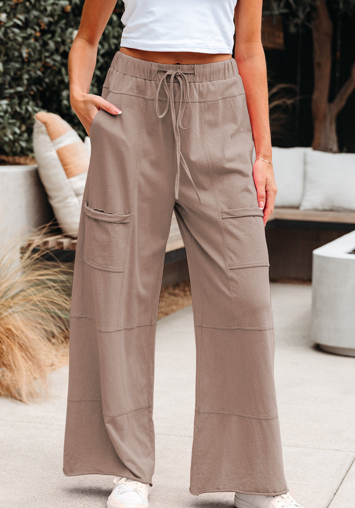 Smoke Gray Mineral Wash Exposed Seam Drawstring Elastic Waistband Wide Leg Cargo Pants