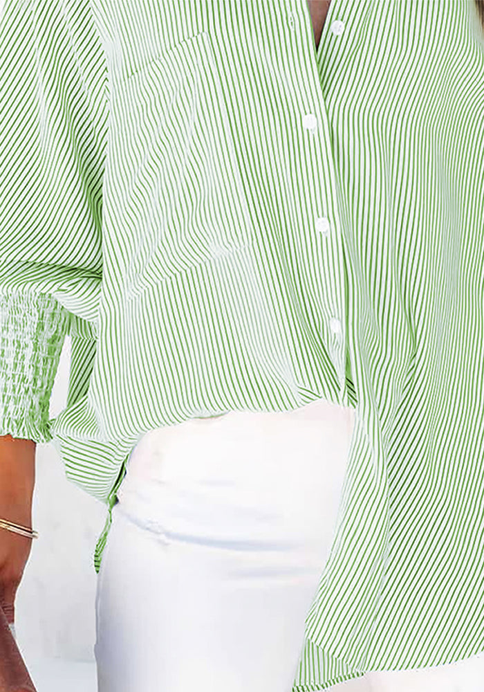 Grass Green Striped Shirred Cuff Buttoned Loose Fit Shirt