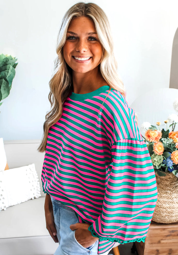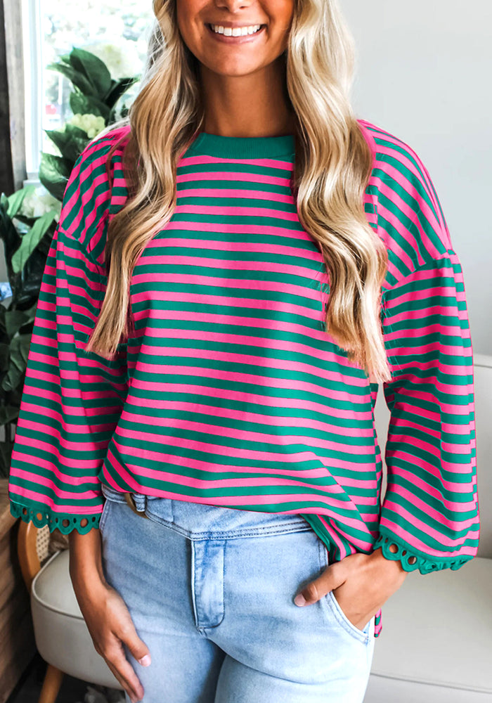Sachet Pink Striped Print Drop Shoulder Lace Trim Bracelet Sleeve Loose Top