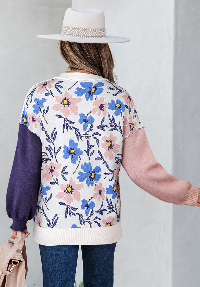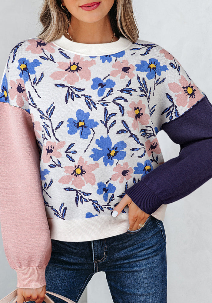 Khaki Floral Panel Colorblock Sleeve Patchwork Sweater