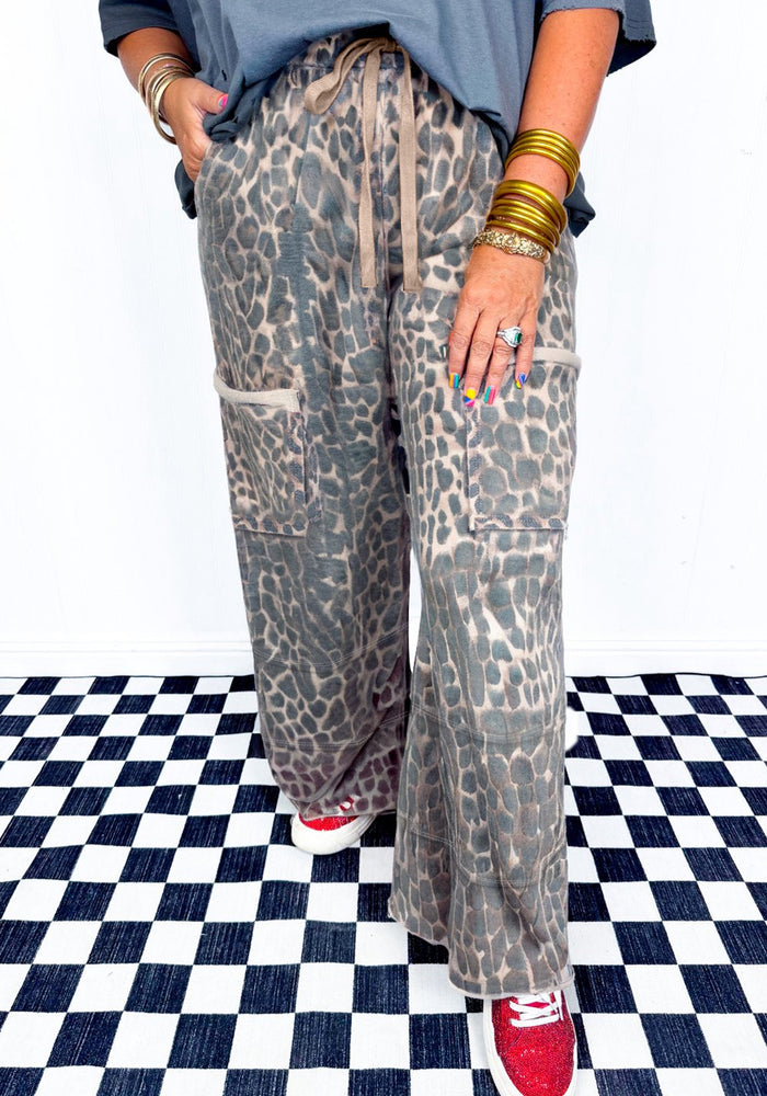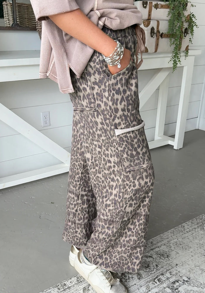 Khaki Plus Size Leopard Print Raw Edge Patch Pocket Drawstring Loose Pants
