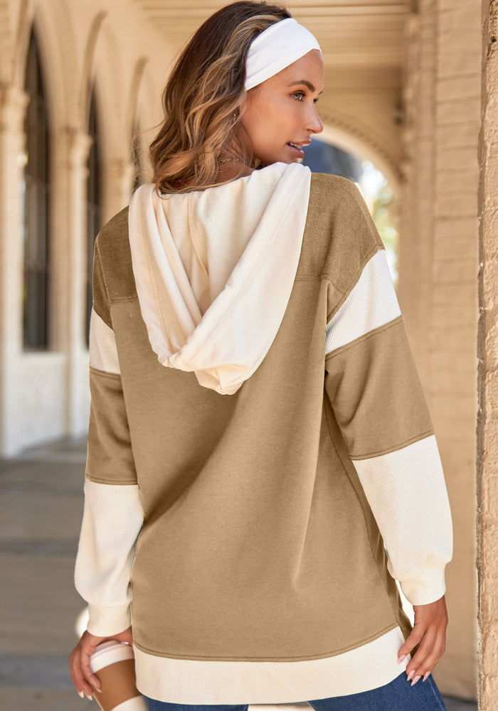 Light French Beige Waffle Contrast Knit Color Block Patchwork Button Front Oversize Hoodie