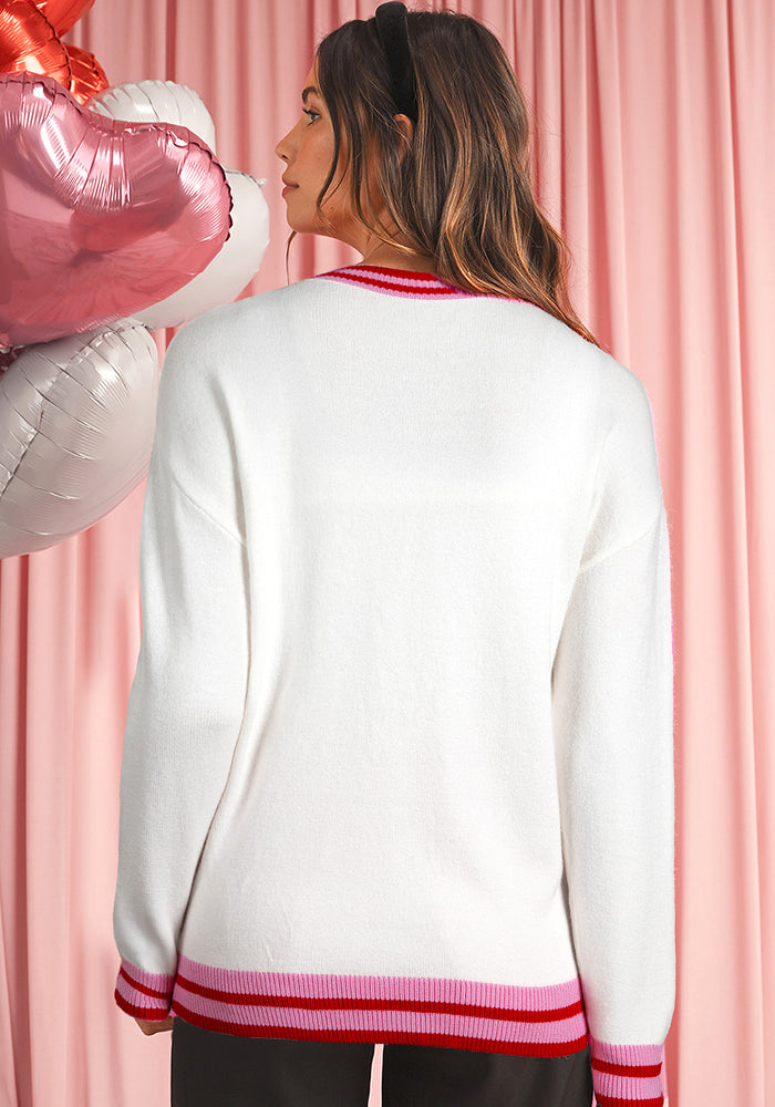 White Striped Trim Bow Graphic Round Neck Drop Shoulder Sweater