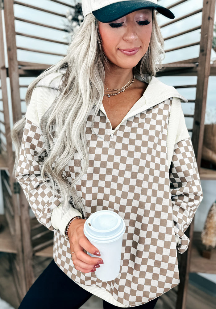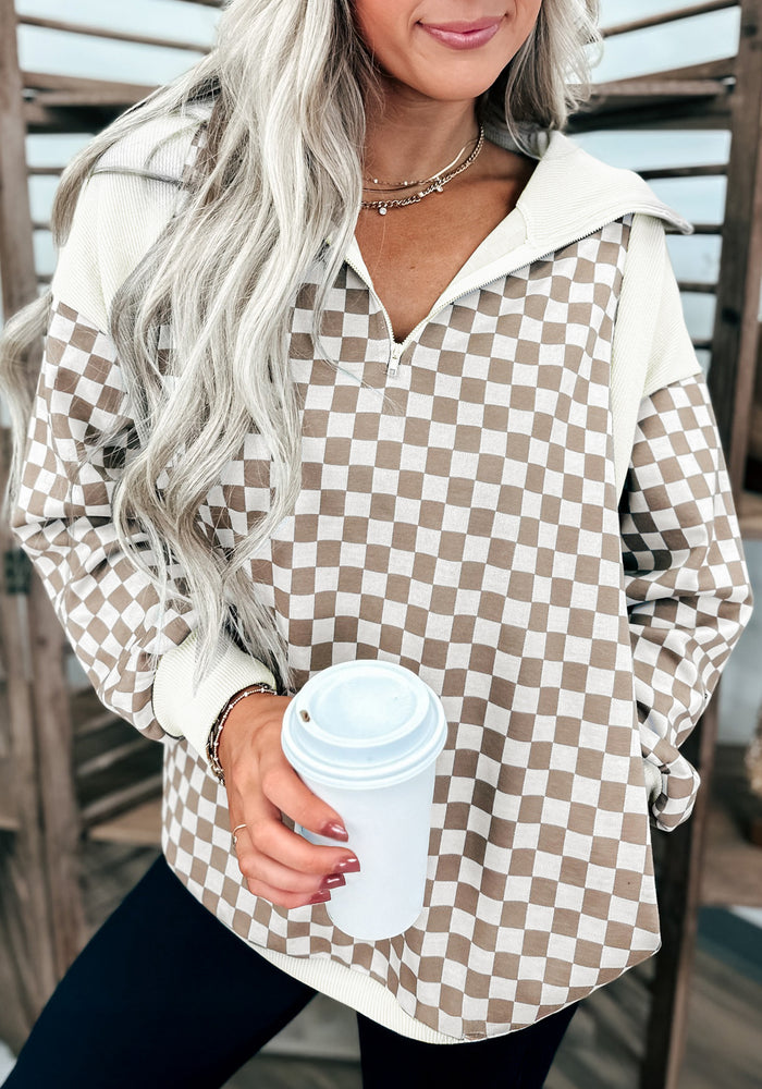 Khaki Checkered Print Quarter Zip Ribbed Patchwork Loose Sweatshirt