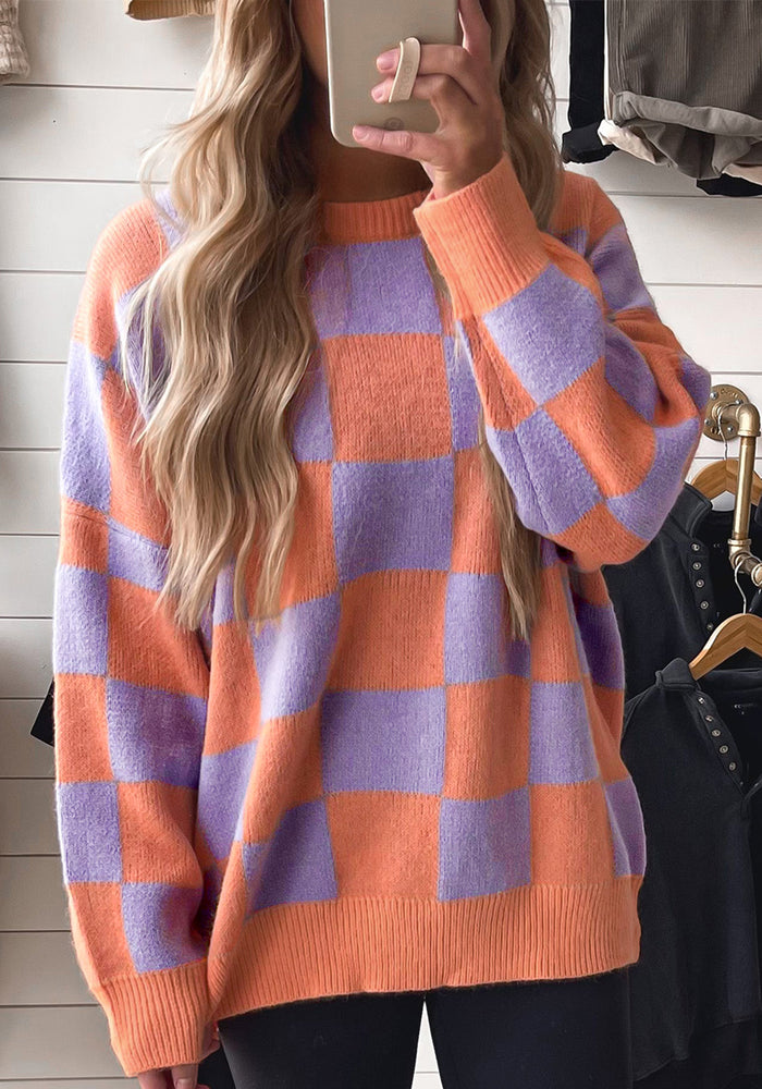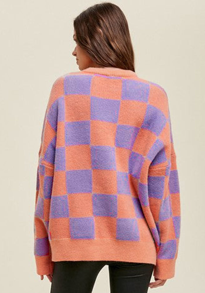 Grapefruit Orange Checkered Pattern Ribbed Trim Knit Baggy Sweater