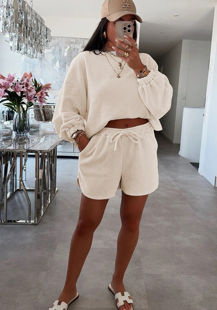 Jet Stream Solid Color Textured Knit Drop Shoulder Pullover Drawstring Shorts Set