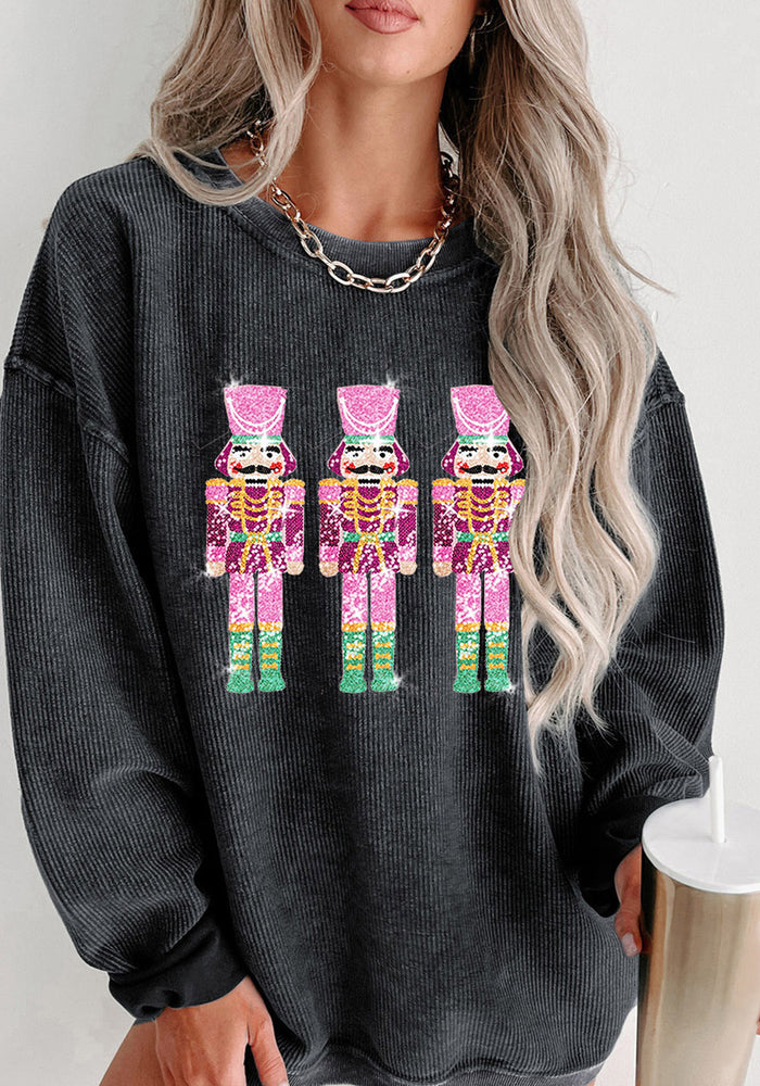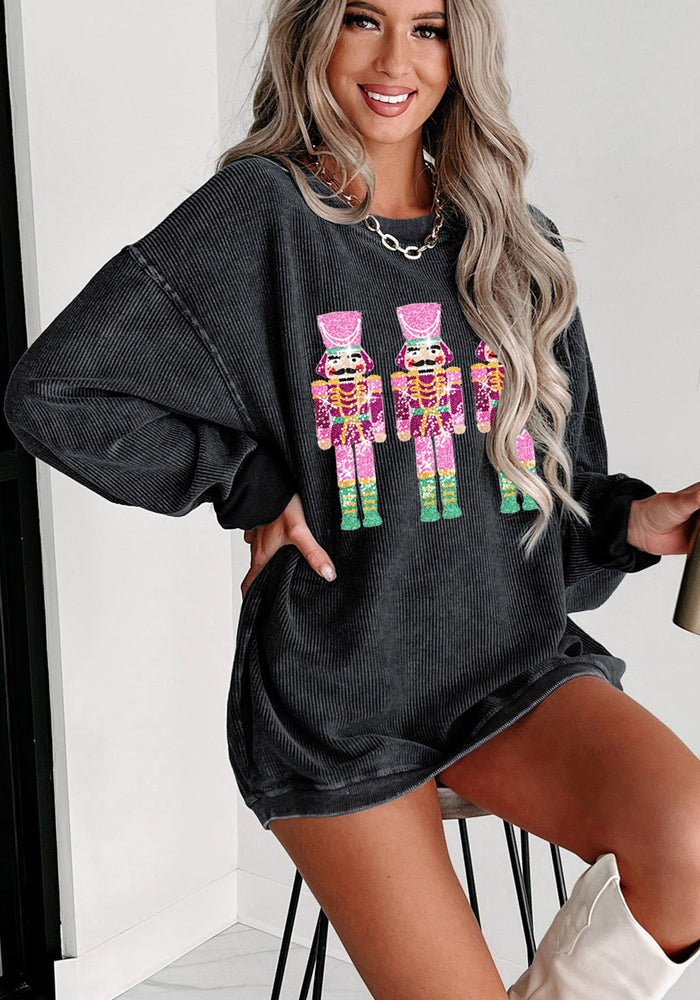 Black Christmas Sequined Nutcrackers Mineral Wash Corded Sweatshirt