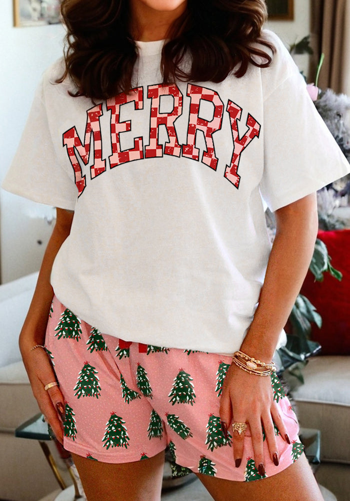 Pink Checkered MERRY Graphic Christmas Tree Print Short Lounge Set
