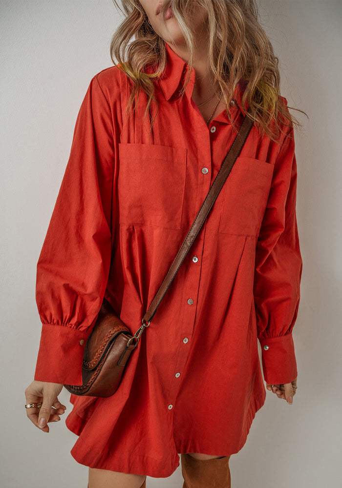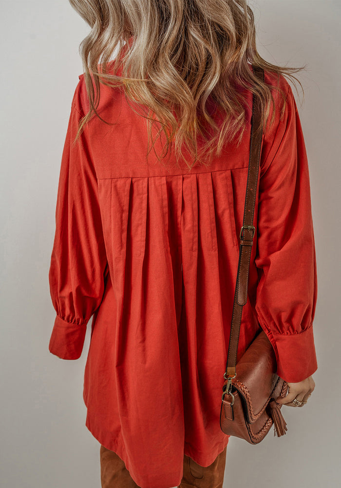 Tomato Red Bishop Sleeve Button Up Pleated Mini Shirt Dress