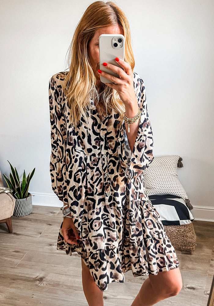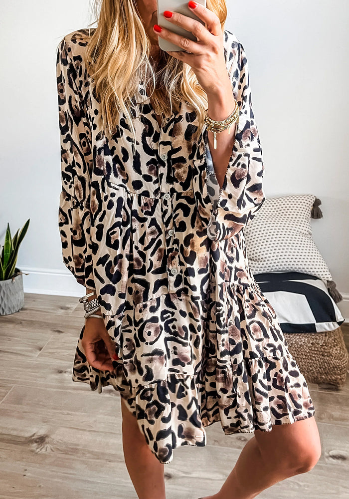 Black Leopard Print Buttoned Front 3/4 Sleeve Tiered Ruffled Hem Dress