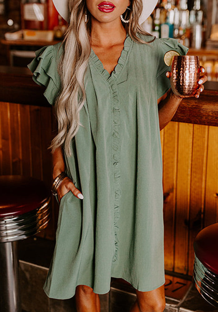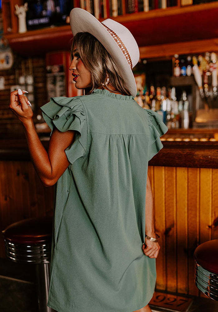 Mist Green Ruffle Sleeve V Neck Frilled Shift Dress