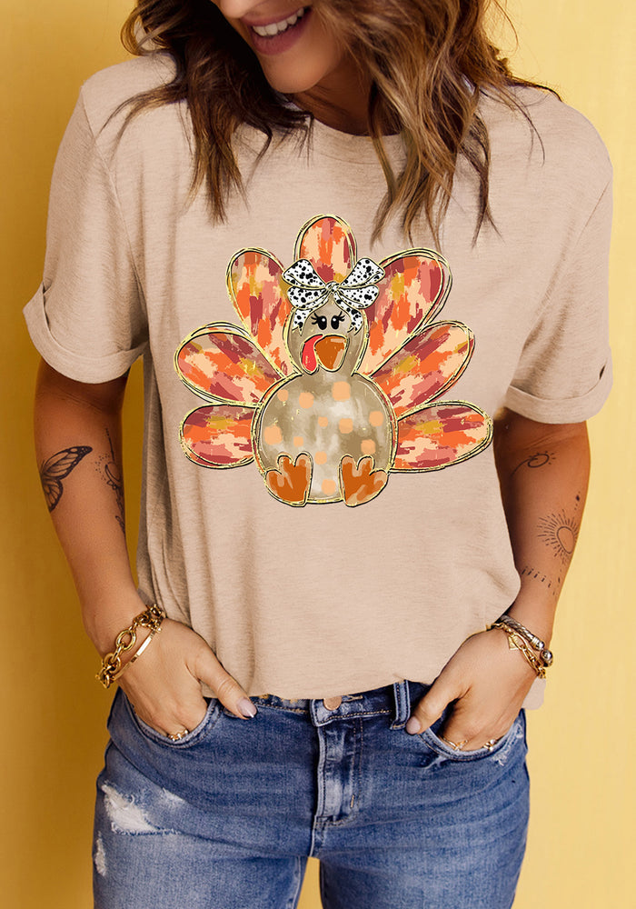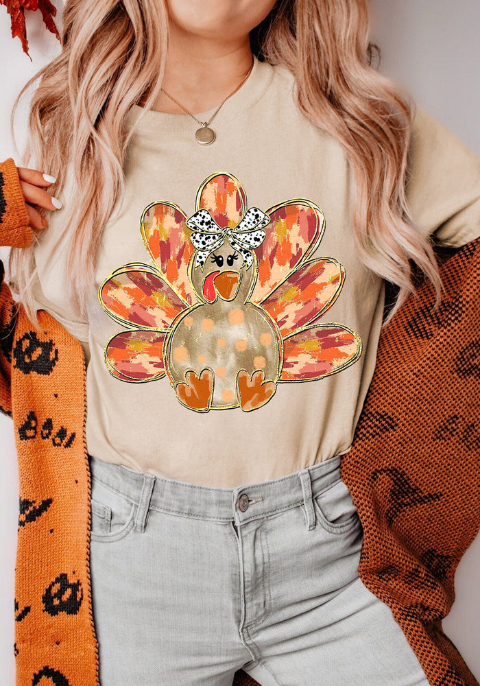 Khaki Thanksgiving Bowknot Turkey Graphic Crewneck Tee