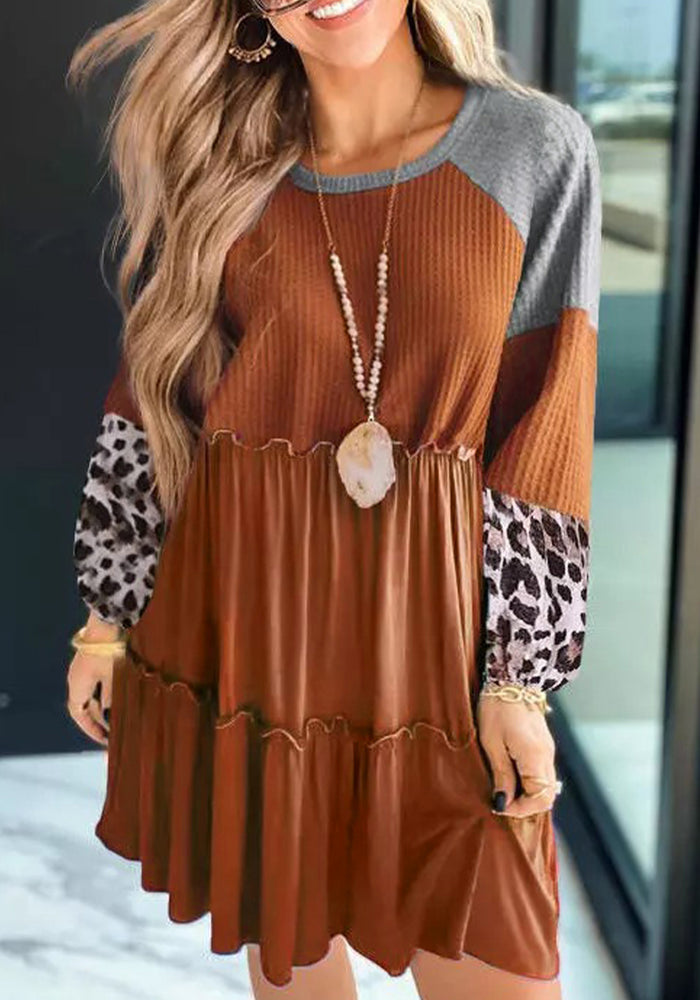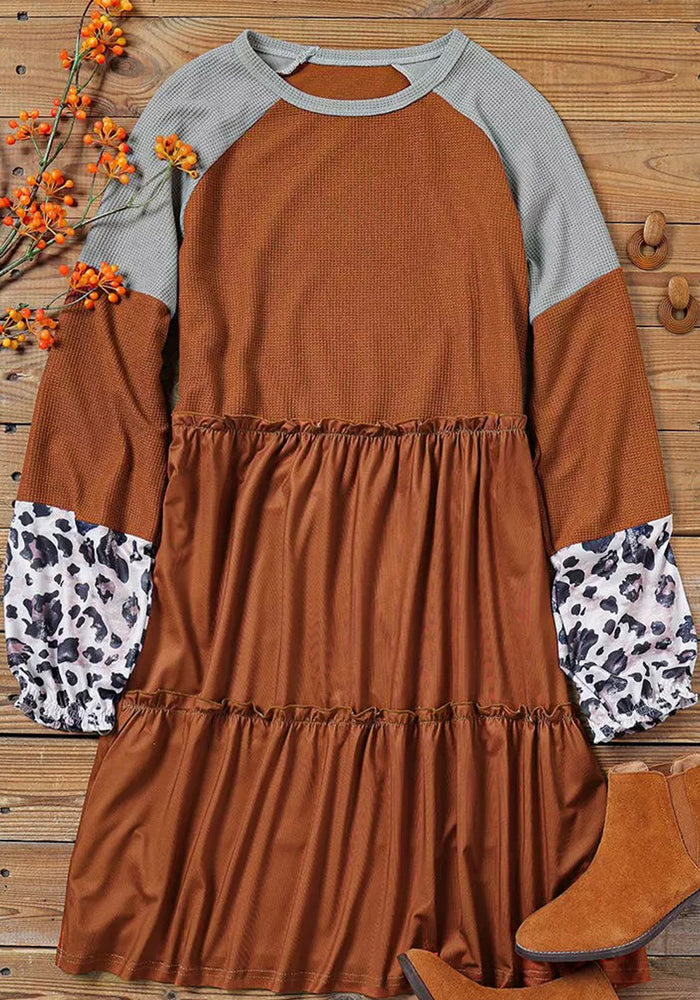 Brown Waffle Knit Leopard Patchwork Long Sleeve Dress
