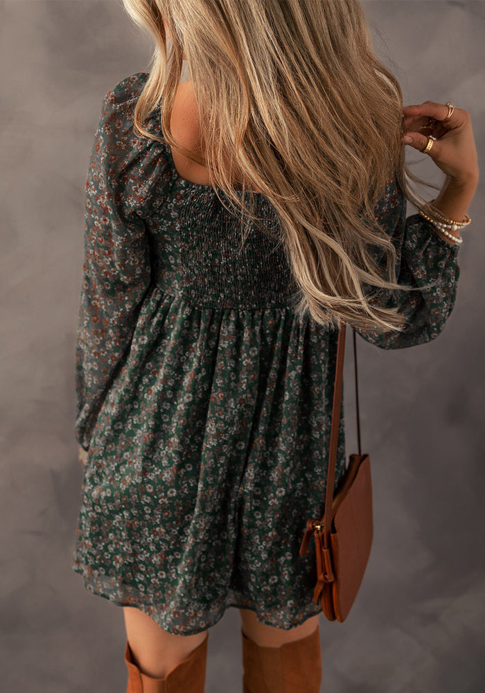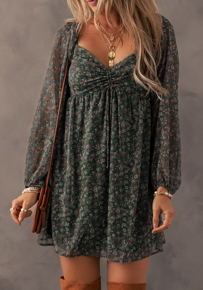 Green Floral Print Sweetheart Neck Shirred Back Mini Dress