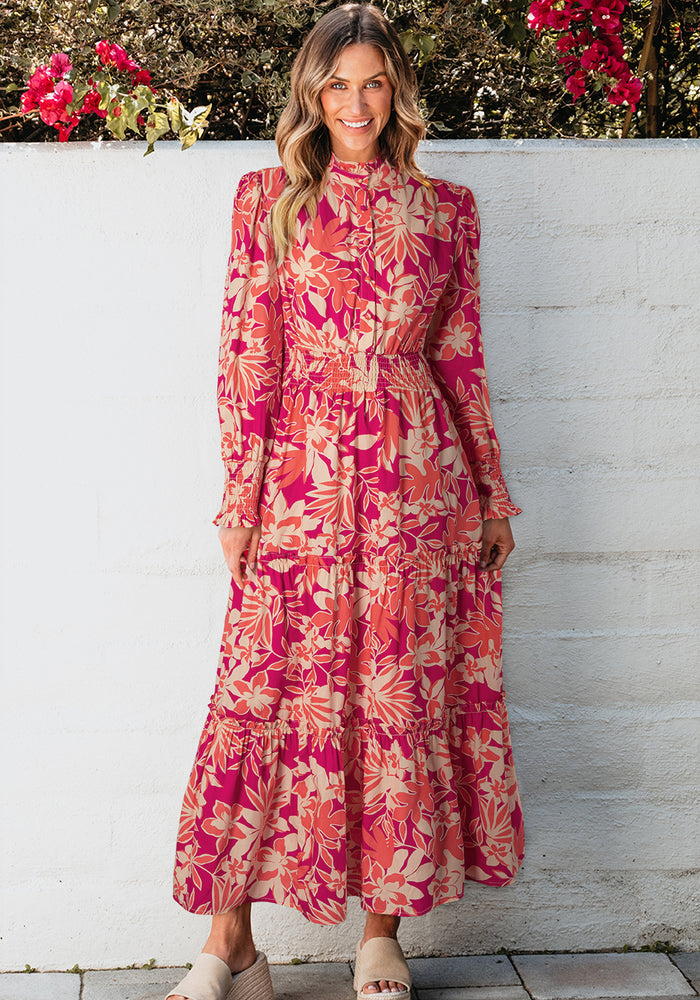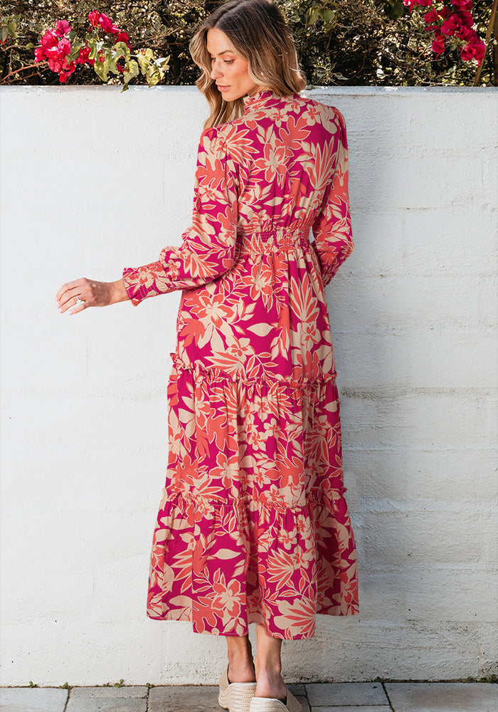 Rose Floral Print Buttoned Smocked High Waist Maxi Dress