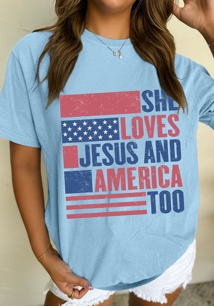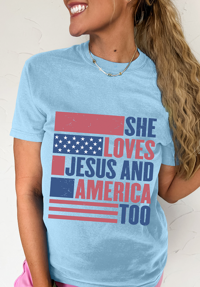Light Blue SHE LOVES JESUS AND AMERICA TOO Flag Graphic T Shirt