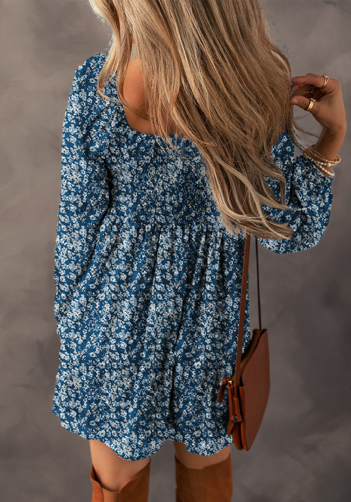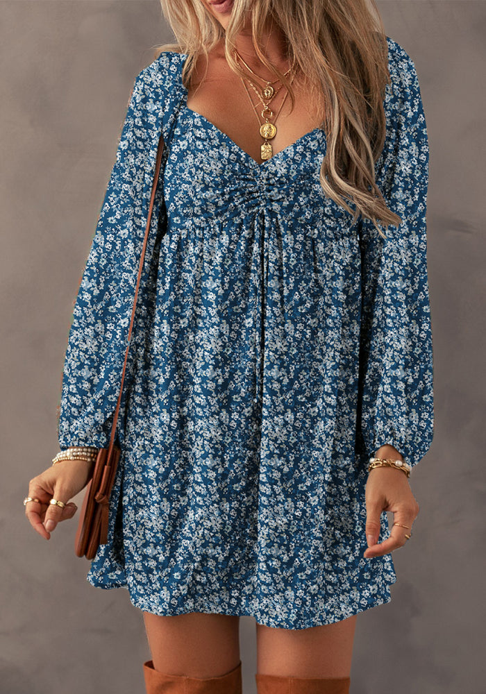Blue Floral Print Sweetheart Neck Shirred Back Mini Dress