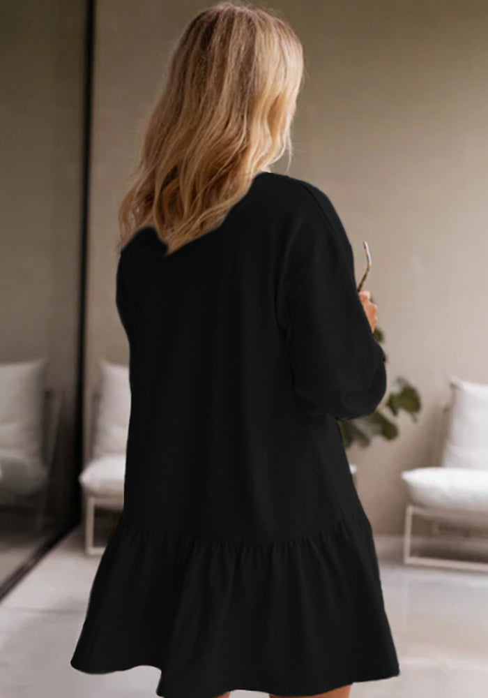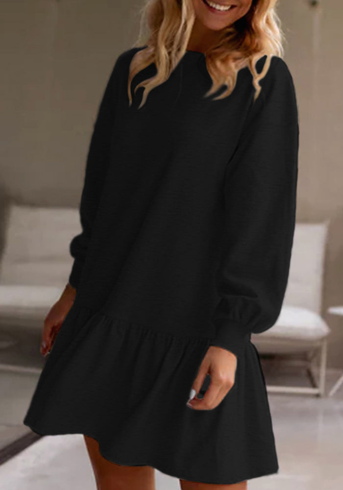 Black Solid Color Puff Sleeve Ruffle Hem Mini Dress