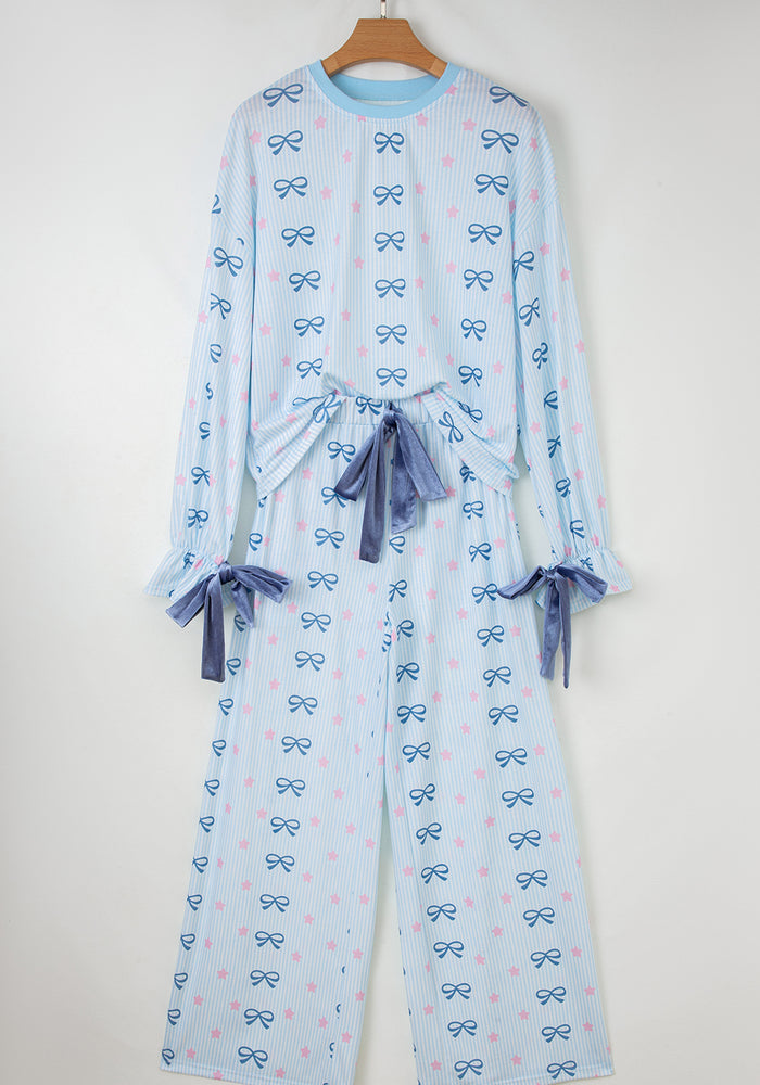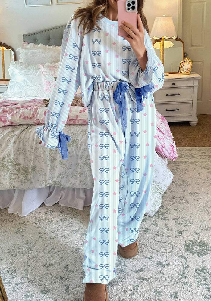 Sky Blue Stripe Bow Star Print Tied Detail 2pcs Lounge Set