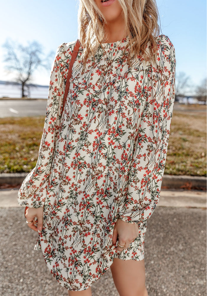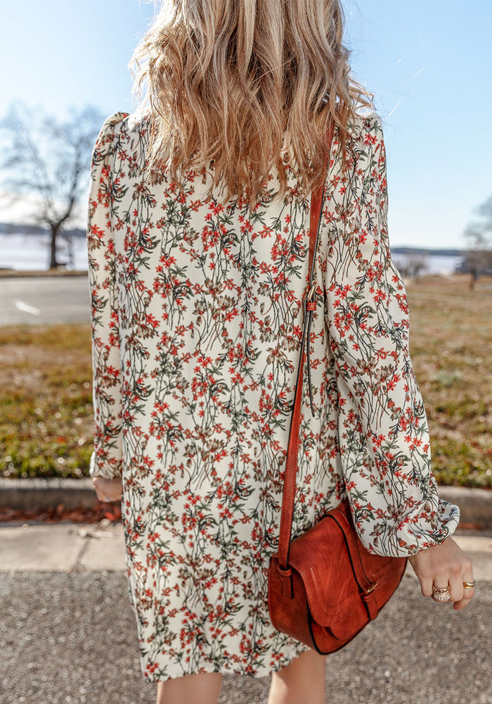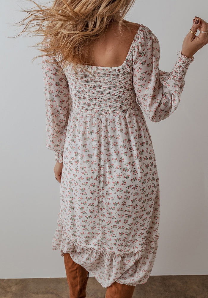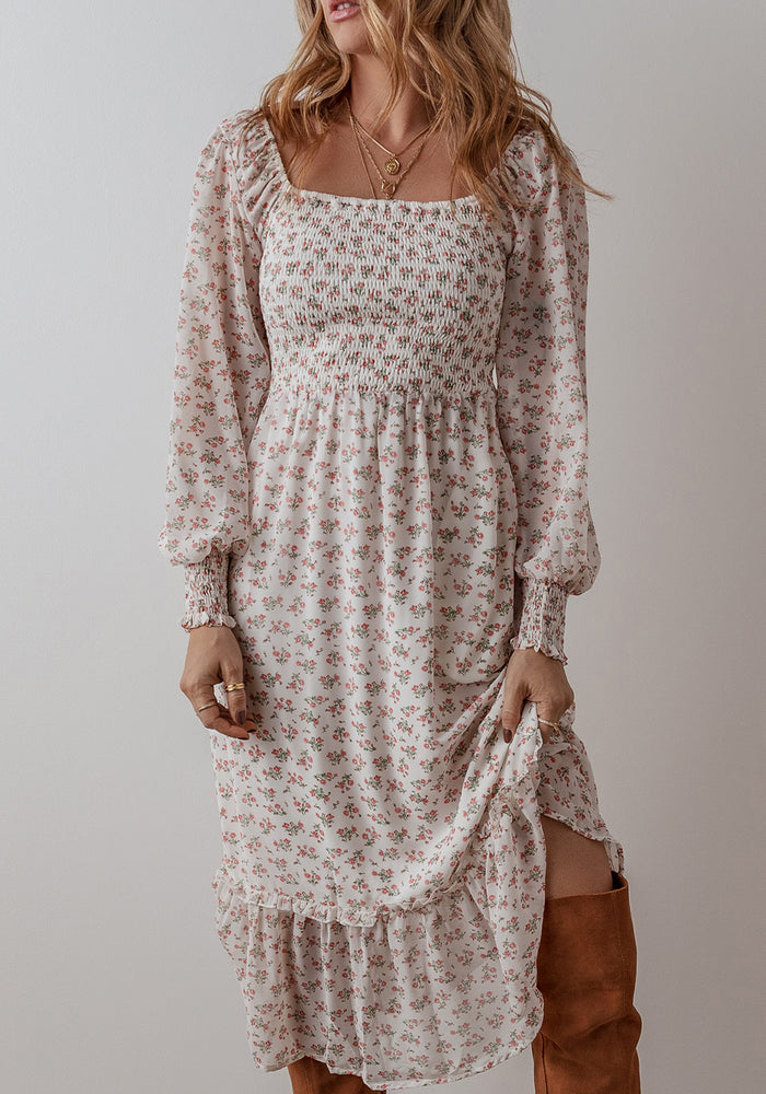 White Floral Print Shirred Ruffled Hem Square Neck Midi Dress