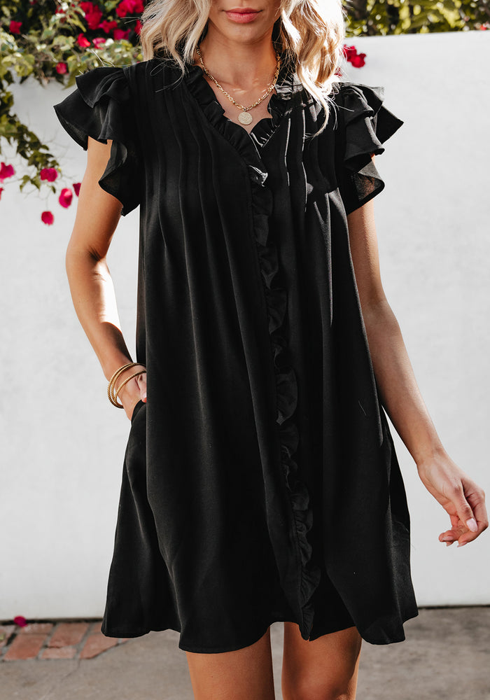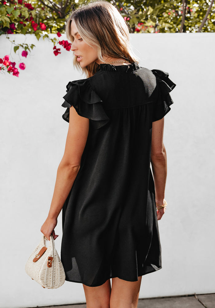 Black Ruffle Sleeve V Neck Frilled Shift Dress