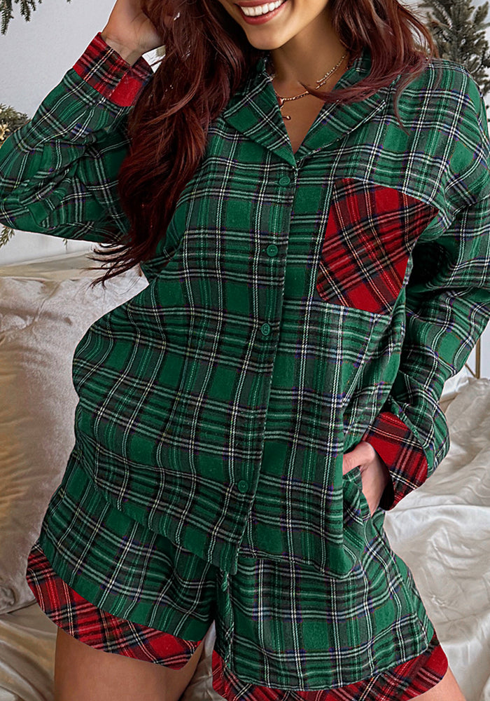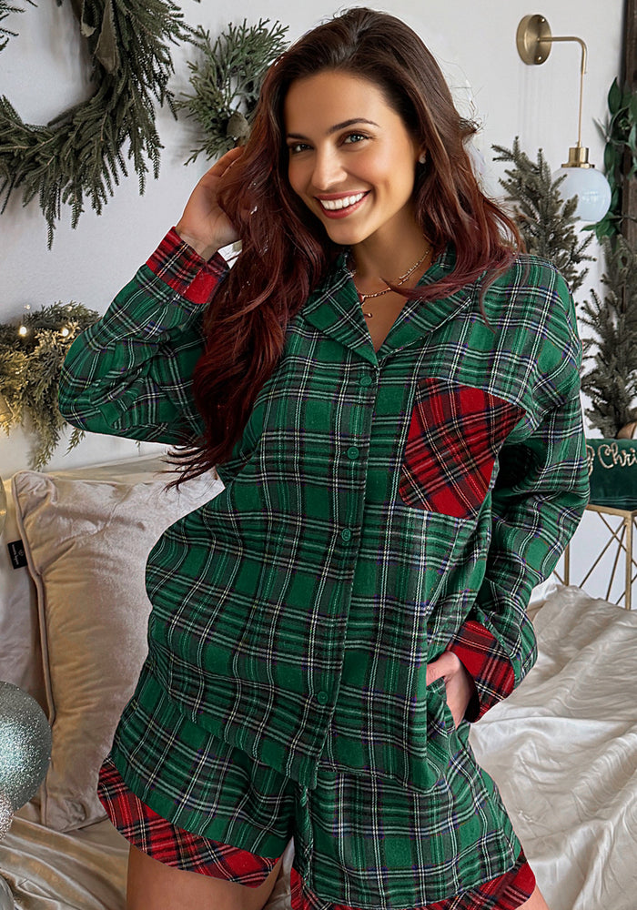 Green Plaid Contrast Patched Christmas Holiday Long Sleeve Shirt and Short 2pcs Pajama Set