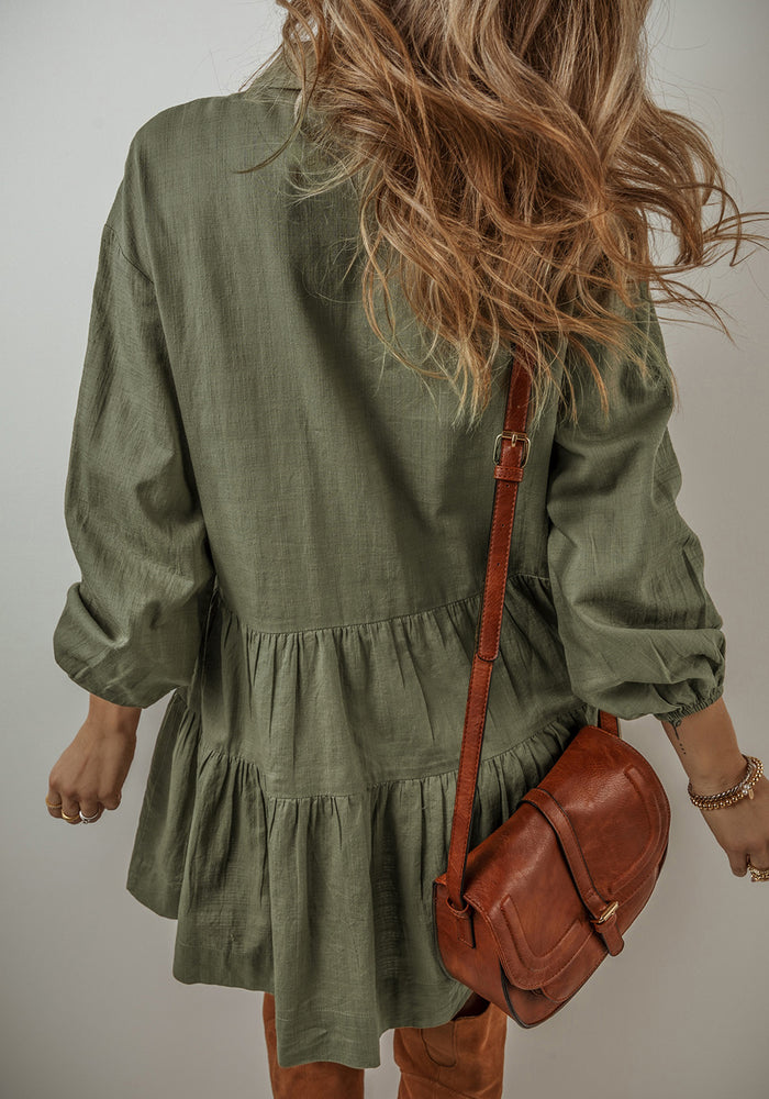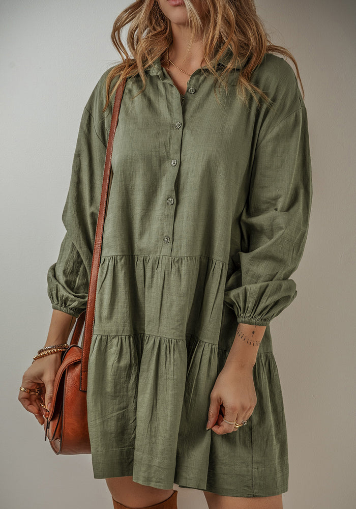 Jungle Green Puff Sleeve Buttoned Tiered Pleated Shirt Mini Dress