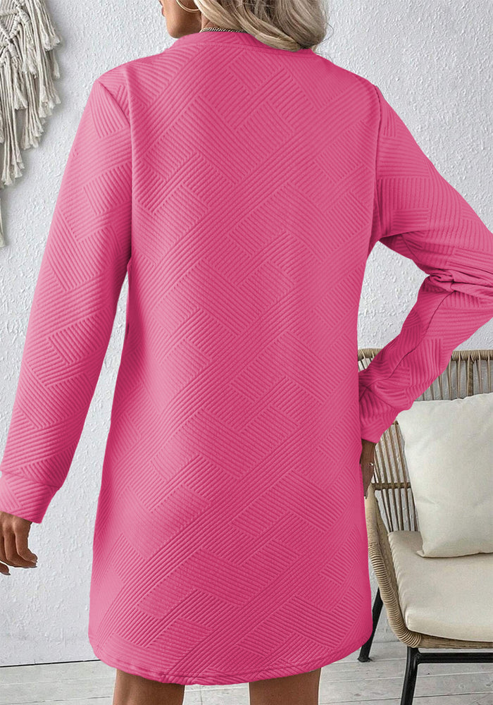 Rose Red Solid Color Textured Long Sleeve Shift Dress