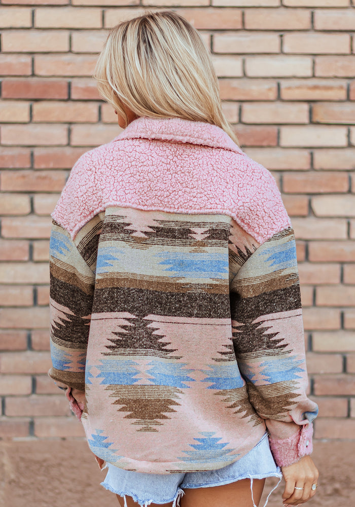Pink Western Aztec Print Sherpa Splicing Buttoned Flap Pocket Coat