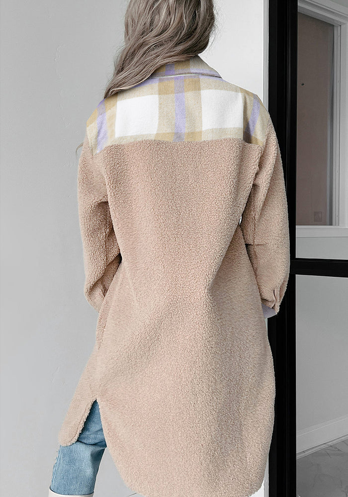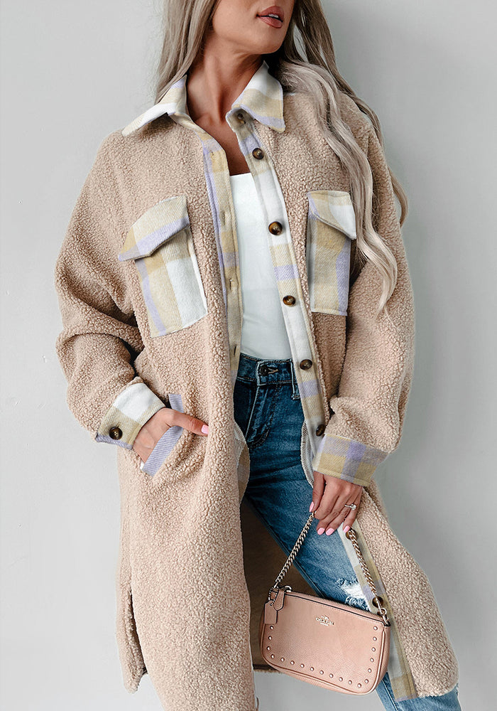 Smoke Gray Plaid Patchwork Collared Button-up Sherpa Long Coat