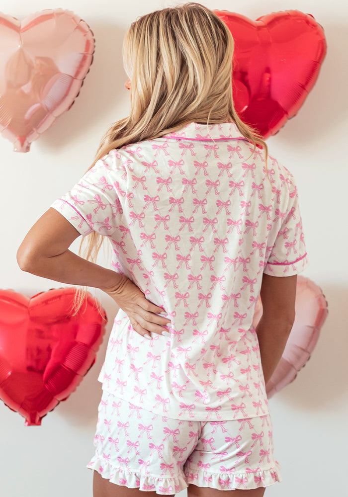 Pink Bowknot Printed Short Sleeve and Ruffled Shorts Pajama Set