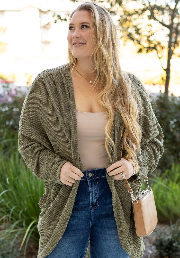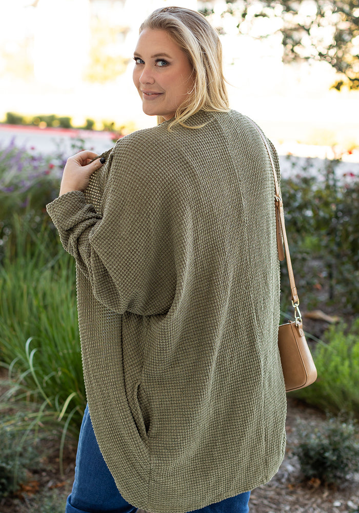 Seagrass Waffle Knit Drop Shoulder Open Front Pocketed Plus Size Cardigan