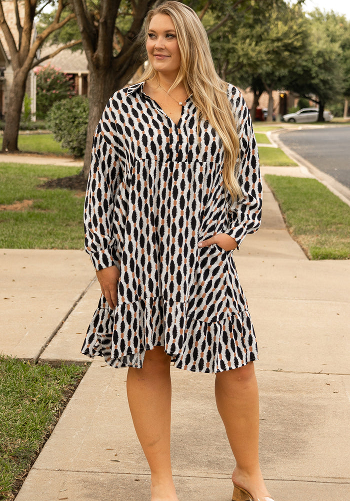 Apricot Geometric Print Collared V Neck Plus Size Mini Dress