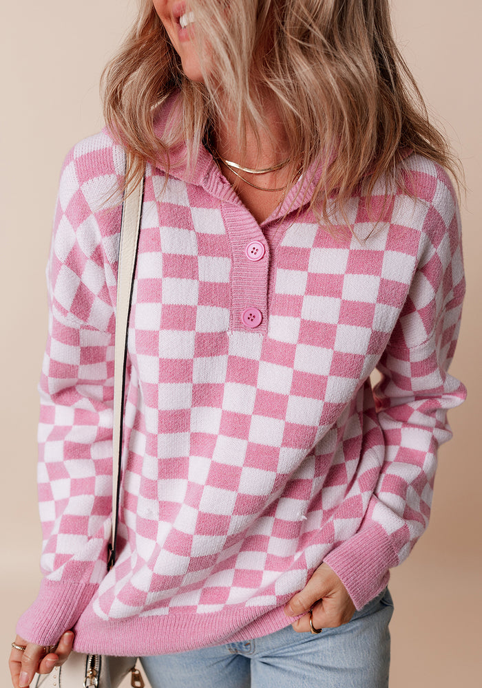 Pink Checkered Buttons Collar V Neck Drop Shoulder Sweater