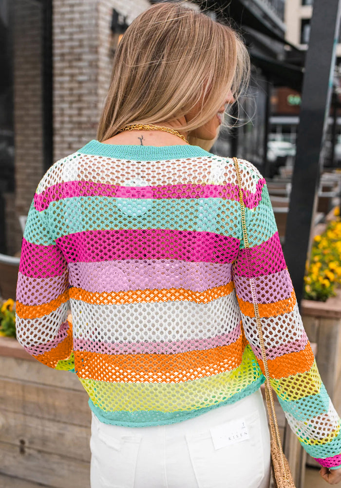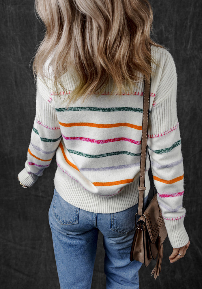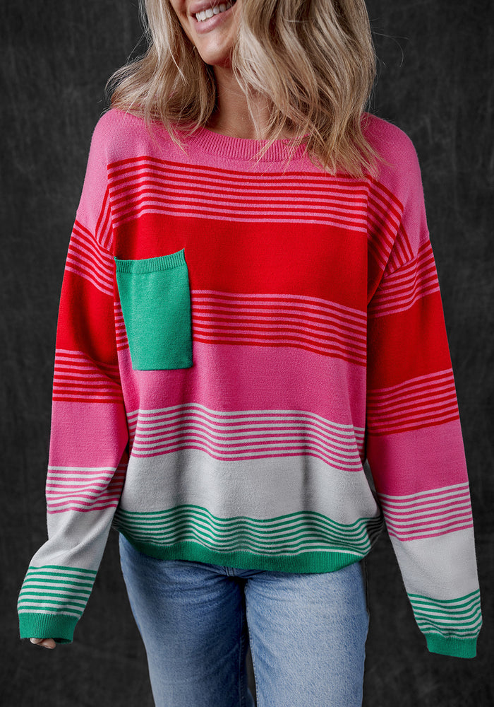 Rose Striped Knit Patch Pocket Drop Shoulder Sweater