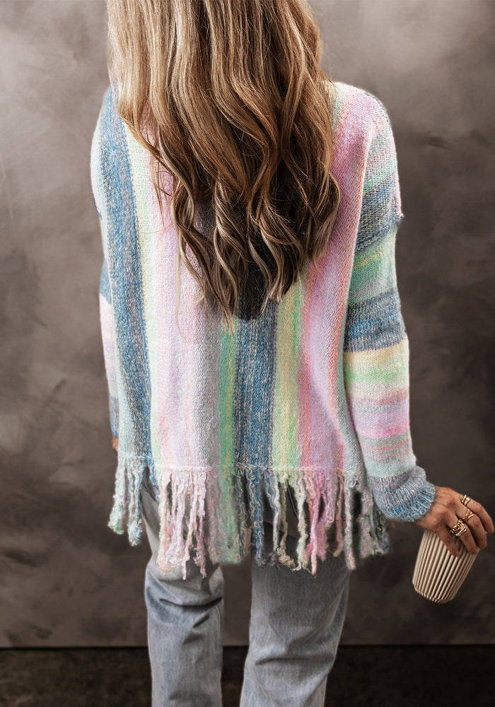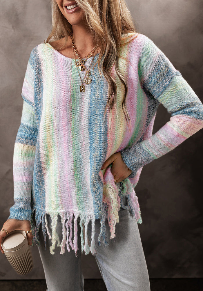 Purple Color Block Fringed Drop Shoulder Tunic Sweater