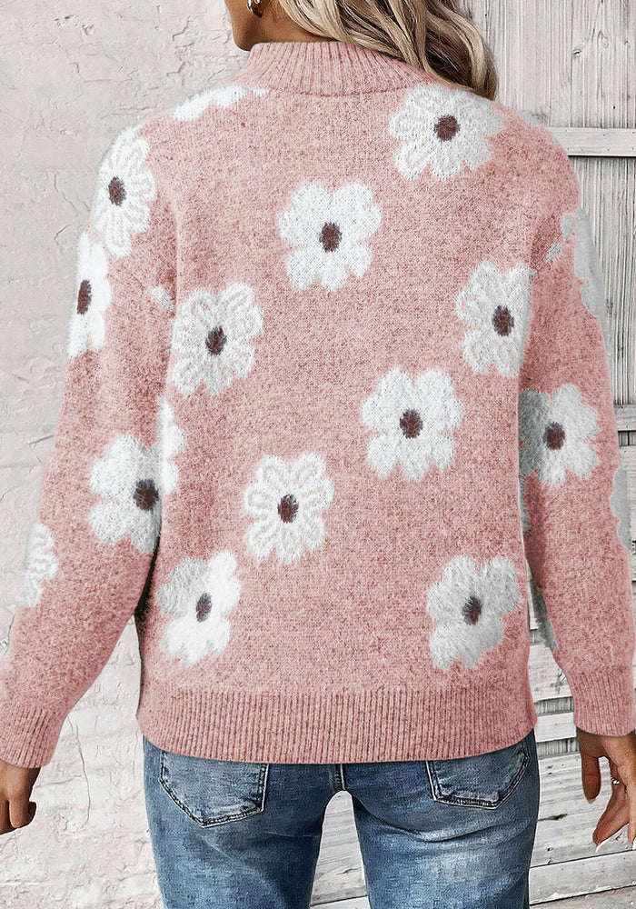 Pink Floral Pattern Half Zip Drop Shoulder Sweater