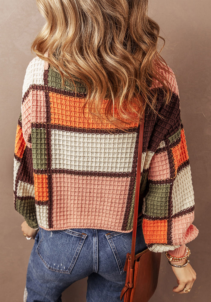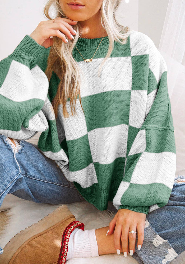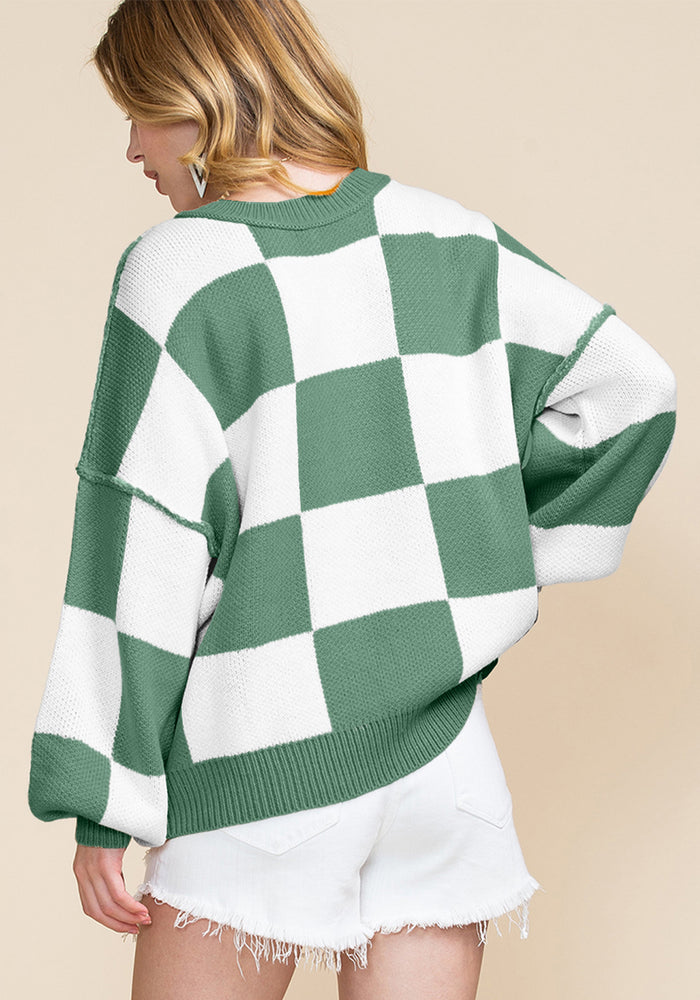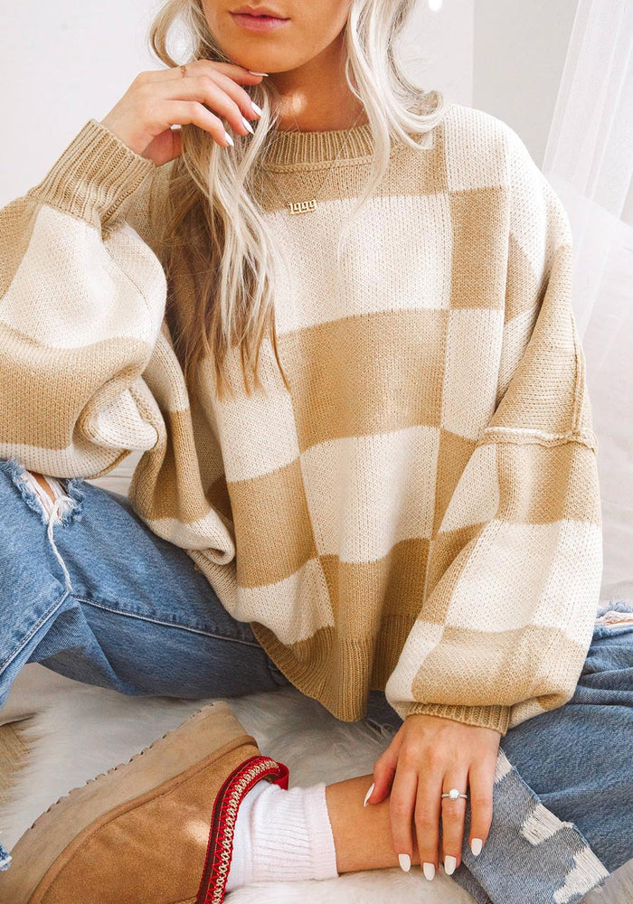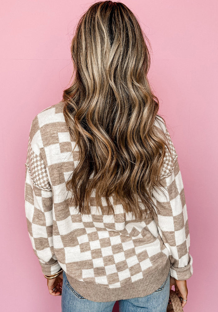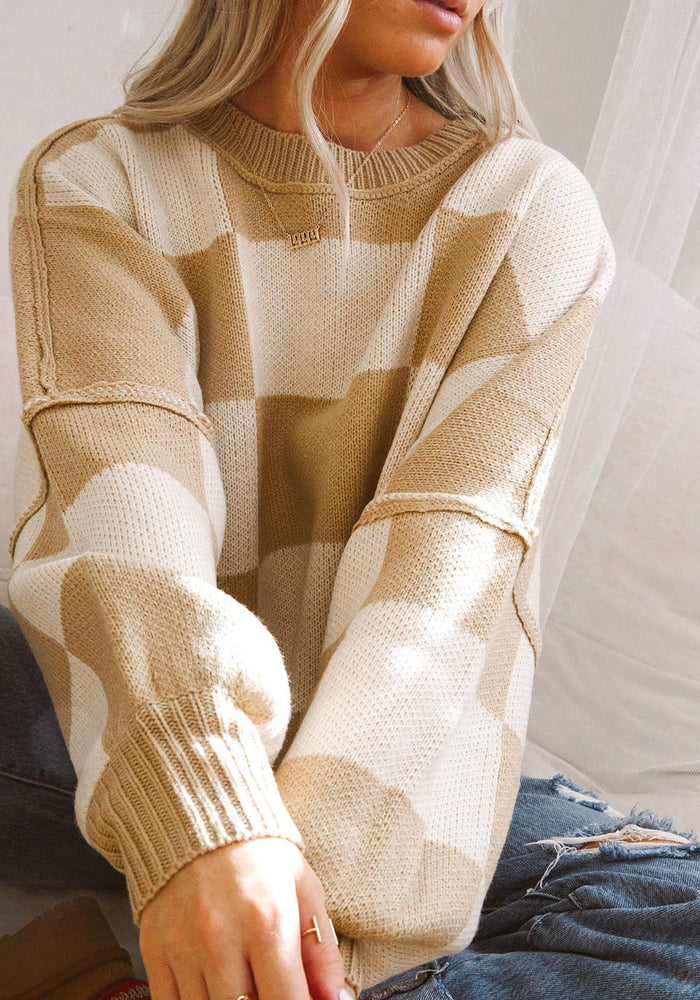 Khaki Checkered Print Drop Shoulder Round Neck Sweater