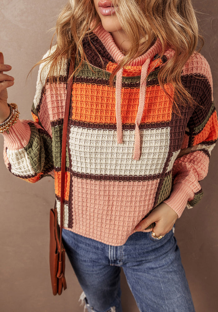 Orange Color Block Waffle Knit Drawstring Mock Neck Sweater