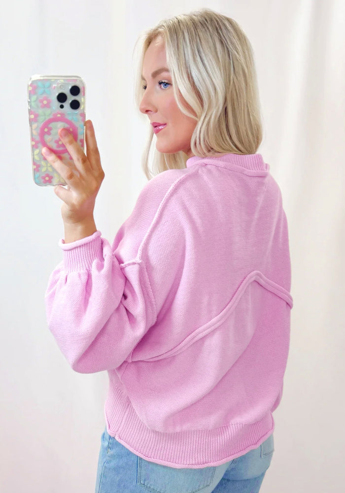 Pink Raw Edge Ribbed Detail Drop Shoulder Sweater