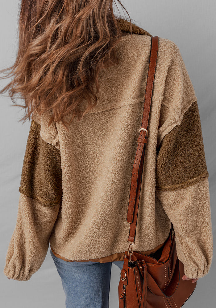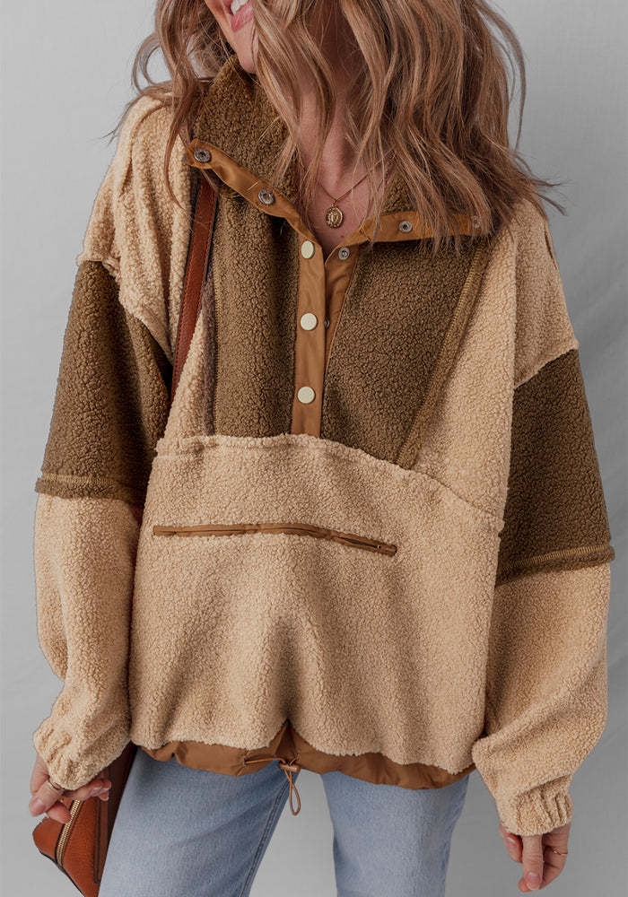 Straw Yellow 2-tone Color Block Patchwork Half Button Sherpa Sweatshirt