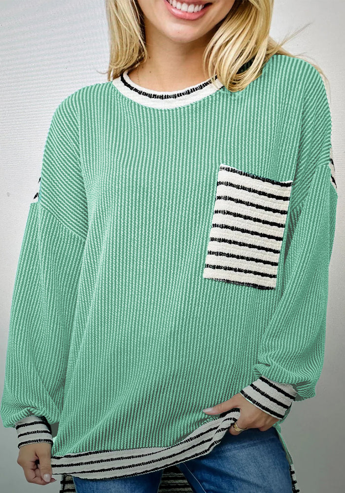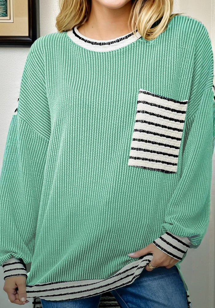 Sea Green Twisted Ribbed Contrast Round Neck Striped Patchwork Long Sleeve Top