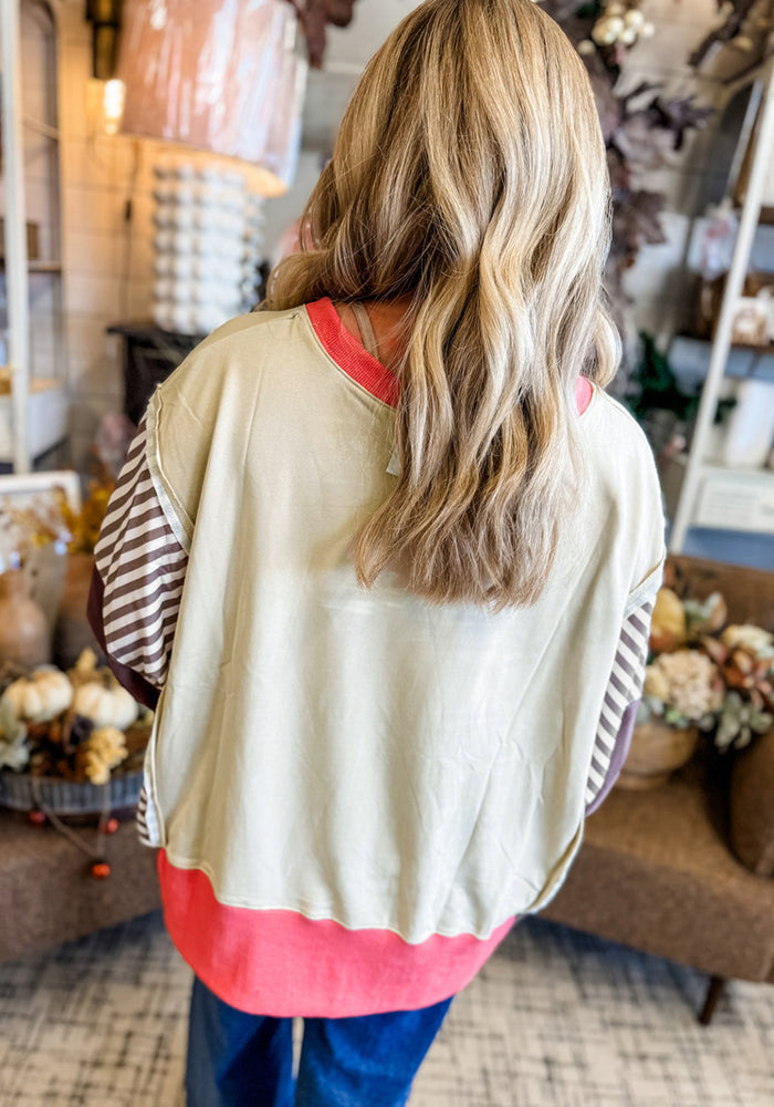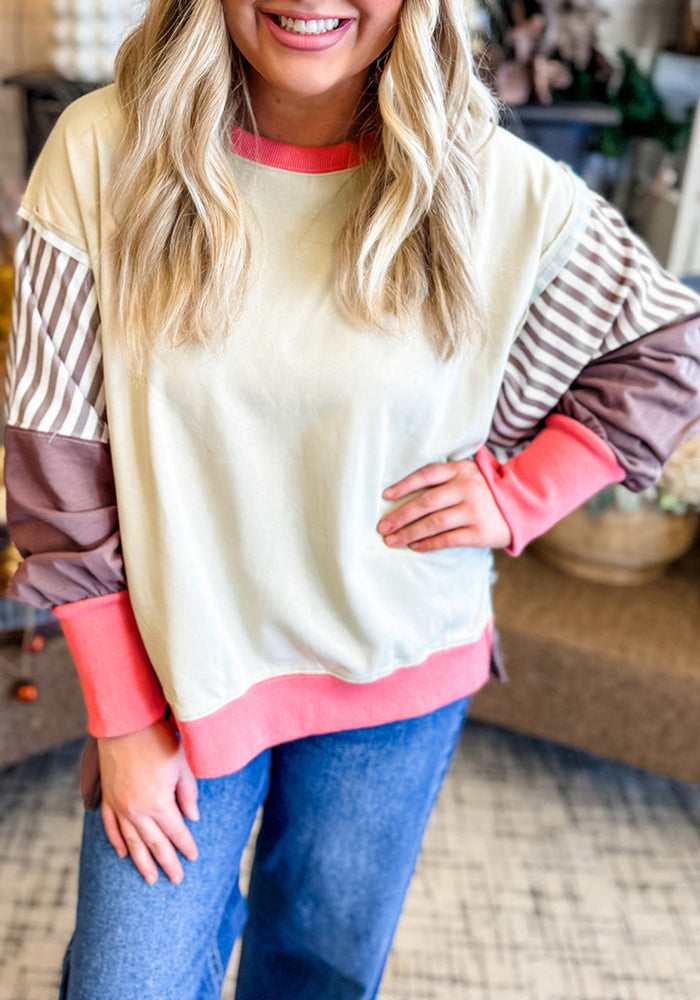 White Color Block Striped Patchwork Dolman Slit Sweatshirt