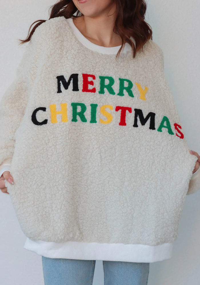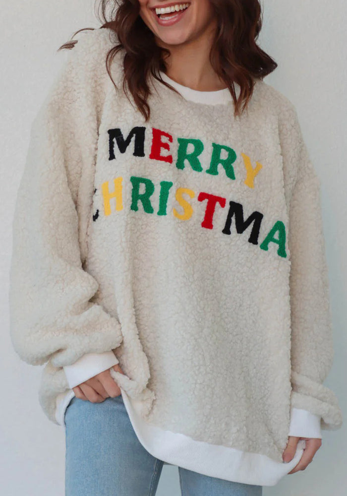 White MERRY CHRISTMAS Multicolor Embroidered Sherpa Pullover Sweatshirt
