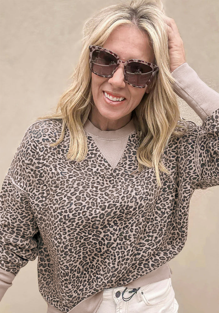 Khaki Leopard Print Patchwork Crew Neck Sweatshirt