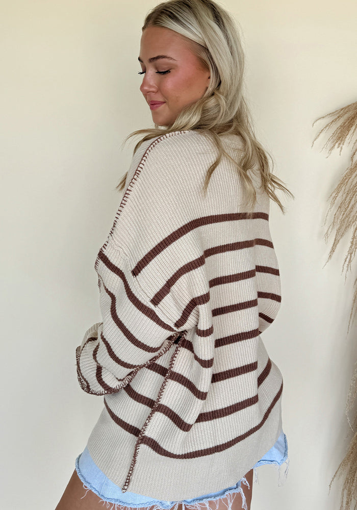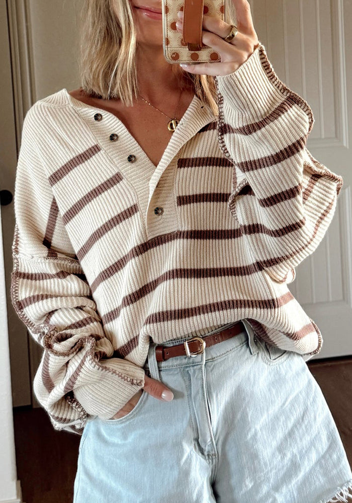 Brown Stripe Ribbed Henley Drop Shoulder Slouchy Sweater